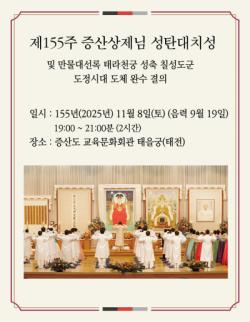 제 155주 천지성부 삼신일체 증산 무극상제님 성탄절을 맞아 성탄대천제를 봉행합니다. 상제님의 은혜를 기리며 대치성에 많은 참여 바랍니다.○ 일시 : 도기 155년 11월 8일 토요일 (음력 9. 19) 저녁 7시 00분 ○ 장소 : 증산도 교육문화회관 태을궁(太田)※ ...