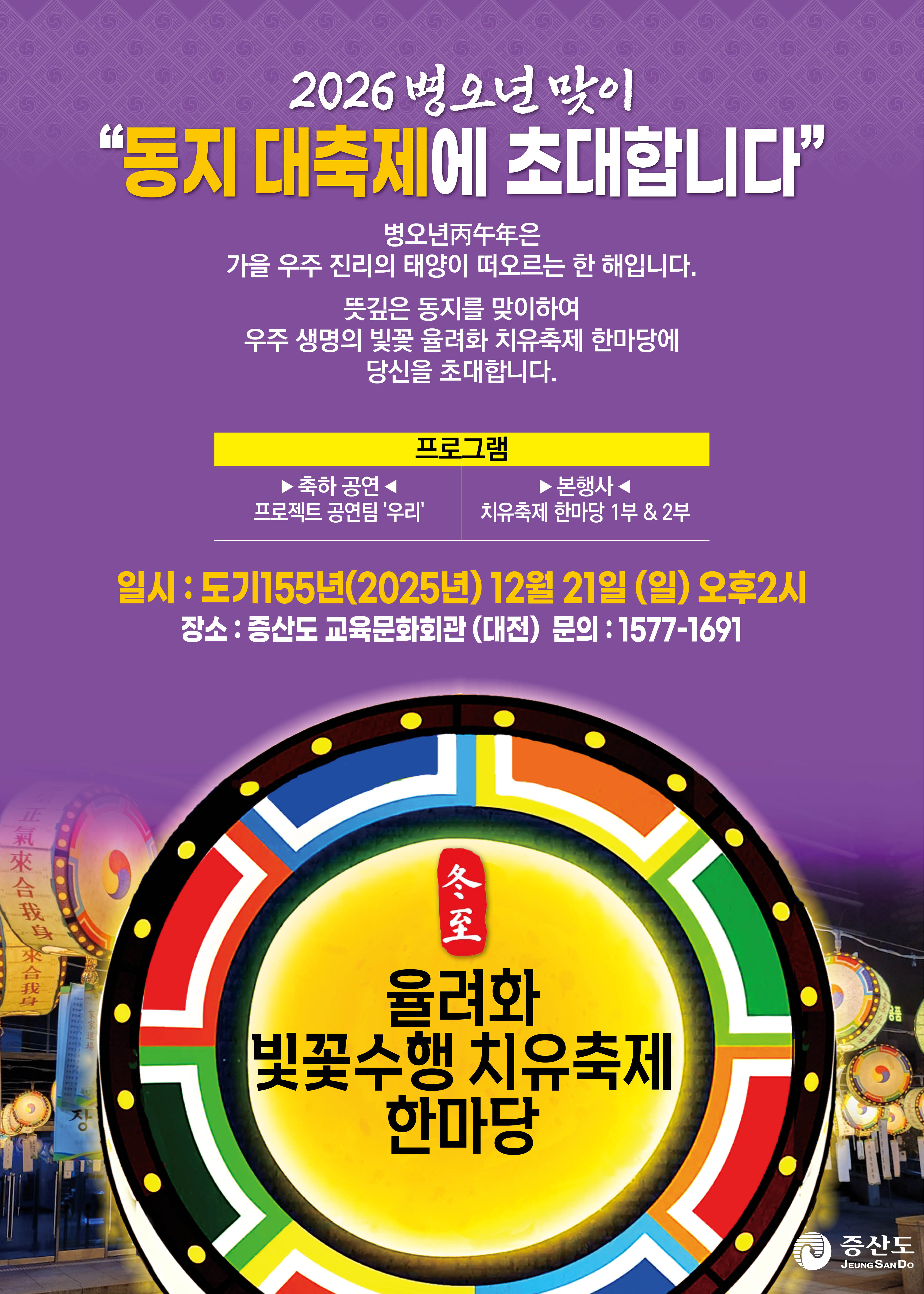 도기道紀 155년 12월 21일(일) <우주 생명의 빛꽃 율려화 치유축제 한마당>과 다음 날인 12월 22일(월)에는 동지 대천제가 봉행됩니다. 병오년 새해 첫 기운이 시작되는 일양시생一陽始生의 성스러운 동지를 맞아 한 해의 서원을 세우고 대치성을 올리며 종도사님 도훈 말씀을 듣는 소중한 시간이 준비되어 있습니다.○&n...