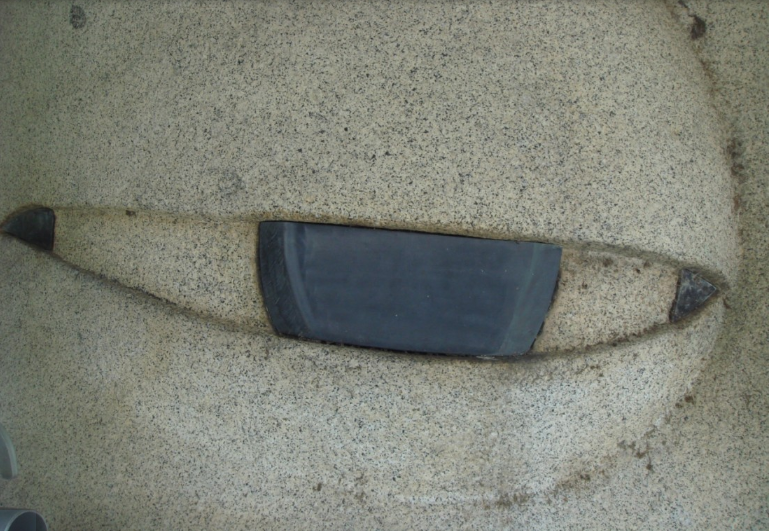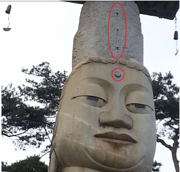 밑에서 보기엔 눈을 돌(화강암)에 새긴 뒤 눈동자와 눈의 양 옆 내외안각 주름 부분을 검은 색으로 채색한 것으로 보였다. 그러나 막상 올라와 보니 그게 아니었다. 따로 흑색 점판암에 눈동자와 내외안각 주름을 제작한 뒤 미리 파놓은 원판(화강암)의 눈 모양에 정교하게 끼워넣은 것으로 확인됐다.