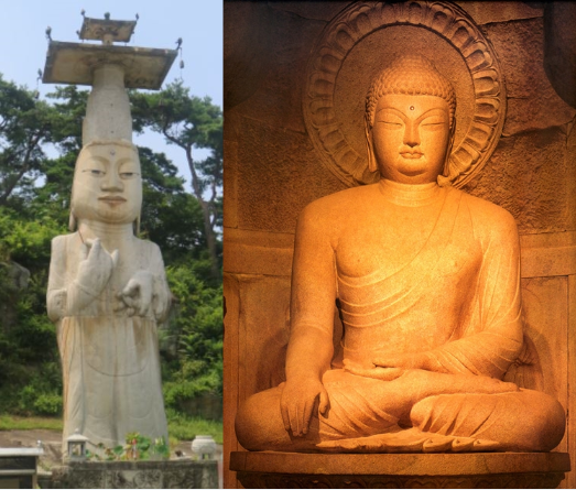 은진미륵과 석굴암 본존불의 전신 비교. 예전에는 석굴암 본존불(오른쪽)과 비교되어 ‘못난이’ 딱지를 얻은 은진미륵(왼쪽)이지만 최근들어 파격과 신비의 미적감각을 지닌 가장 독창성 짙은 작품으로 재평가되고 있다. ‘못난이’에서 ‘상남자’의 부캐를 얻은 셈이다.