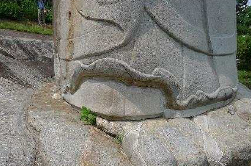 은진미륵의 하체. 발아래로는 바람에 펄럭이는 천의 자락과 이에 상응하게 힘차게 흘러가는 구름이 조각되었다. 이 불상을 조성했다는 혜명 스님의 표현력과 독창성을 반영한다. | 문화재청 제공