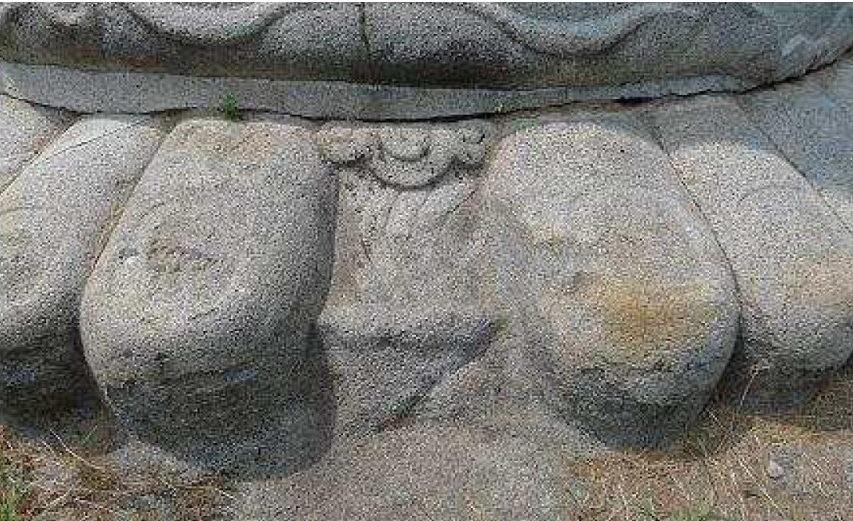 은진미륵의 발부분. 양발은 몸통을 이루는 돌과 별개로 자연석 암반 위에 직접 조각했다. 그 위에 몸통을 올린 것이다. 통통한 발가락에는 거대한 조형과는 어울리지 않게 잘 다듬어진 발톱이 잘 표현되어 있다.