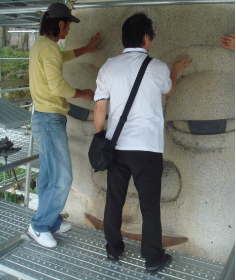 2007년 은진미륵의 상황을 점검하는 연구자들. 대략 아파트 6층 높이의 아찔한 곳에서 불상의 눈부위를 조사하고 있다.|최선주 실장 제공