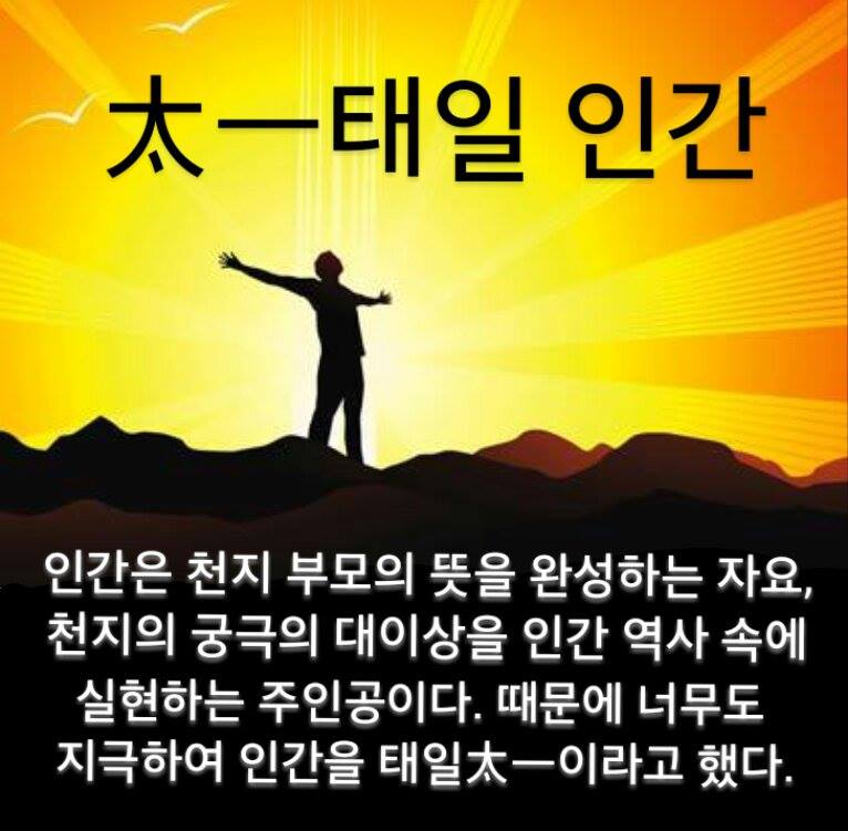 인간은 천지 부모의 뜻을 완성하는 자요, 천지의 궁극의 대 이상을 인간 역사 속에 실현하는 주인공이다. 때문에 너무도 지극하여 인일(人一)이라 하지 않고